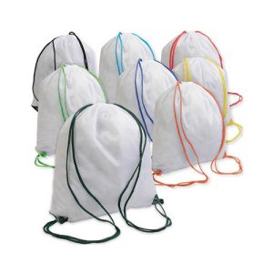 Σακίδιο πλάτης 100% πολυέστερ, 40γρ. Διάσταση: 37Χ40εκ. Σε λευκό χρώμα με χρωματιστά κορδόνια.